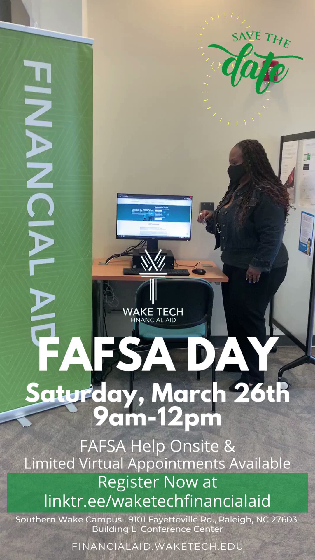 Complete your Free Application for Federal Student Aid FAFSA by June 1 for Fall semester October 1 for Spring semester and April 1 for Summer term. Please activate your email account and check it regularly. Wake Tech Financial Aid Office North Campus.